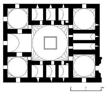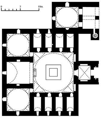 На волне почитания вероучителей в анатолийских центрах во второй половине XIII в. сложился особый тип культового здания, сочетавшего функции квартальной мечети и дервишеской обители текке3\ Такие учреждения становились центрами религиозной и социальной активности, а их строительство и содержание за счет вакуфного фонда35 (как правило, не облагавшегося налогами) не только обеспечивало патронам поддержку влиятельных духовных лидеров, но и приносило финансовую выгоду36. Став «низовой» альтернативой «государственному исламу», дервишеские обители оказались новыми центрами социальной консолидации и аналогично султанским комплексам формировали вокруг себя необходимую инфраструктуру. Непременным элементом текке был квадратный зал, перекрытый куполом, использовавшийся для всех публичных мероприятий коллективных молитв, зикров, сема, диспутов и занятий с учениками-мюридами. Именно купольный зал как центр архитектурной композиции роднит планировку текке с квартальными месджитами, что позже облегчало перестройку обителей в городские мечети.