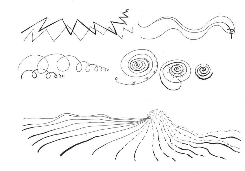 Важно помнить, что на первых этапах рисунка линия определяет размер изображения на листе, его композицию. Один и тот же объект, нарисованный с помощью линии мягкой и волнистой или жёсткой и ломаной, зрительно воспринимается по-разному, приобретая особую художественную выразительность. Посмотрите на эти графические фантазии: это ветка полыни и волшебная новогодняя ёлка в исполнении сказочника-художника.