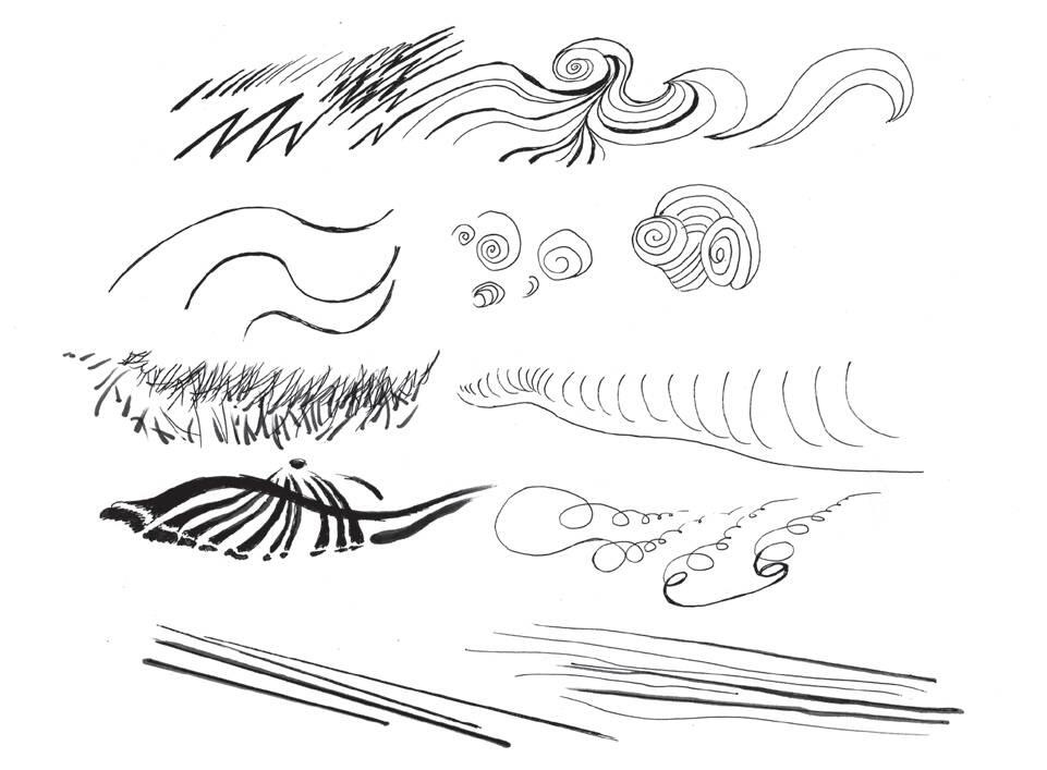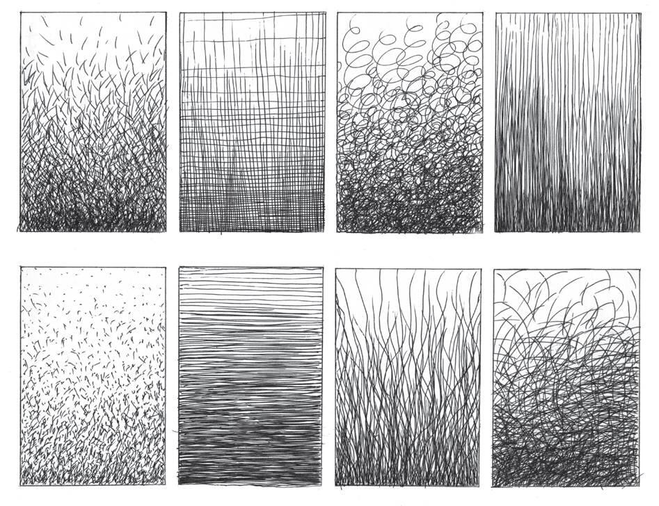 Линейная штриховка может быть очень разной не только в разных направлениях, но и с имитацией каких-то материалов: ракушек, камешков, иголочек или песка. Посмотри внимательно на эти примеры: