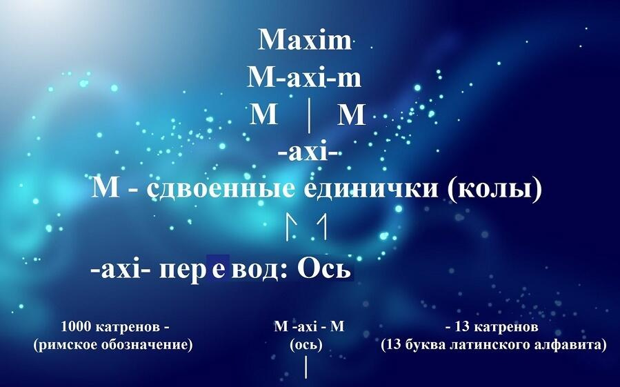 Так как левый разделённый содержит 1000 стихов, а второй разделённый 13, то можно так же выстроить некую модель. Например, 1000 это Большая (заглавная буква М), 13 это буква m в латинском алфавите. Так как 1000 = M, то так же M будет равна и первой части 1001 катрена, т.е. 10-. Тоже самое и с правой частью 13=m, m так же равно второй части катрена 1001, т.е. -01. В катрене 1001 а по середине находится условная линия, которая и разделяет 1 и 1, т.е. делит Сборник по полам. На латинском языке слово ось будет так: -axi-.