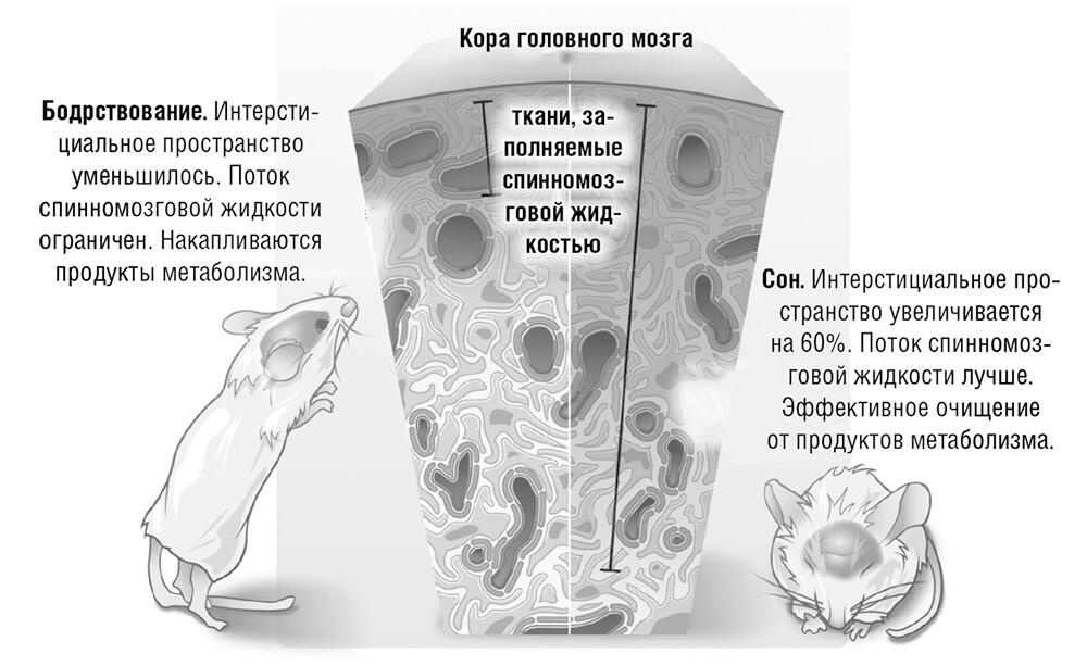 Спинномозговая жидкость просачивается через интерстициальное пространство и в итоге попадает обратно в кровоток через мозговые оболочки защитные мембраны, окружающие мозг. Этот процесс требует много энергии, поэтому Недергаард подозревала, что мозг не может и избавляться от отходов, и обрабатывать сенсорную информацию во время бодрствования. Следуя этому предположению, Лулу Се потратила два года на то, чтобы приучить мышей спать под микроскопом и выяснить, повышается ли активность их глимфатической системы во время сна.