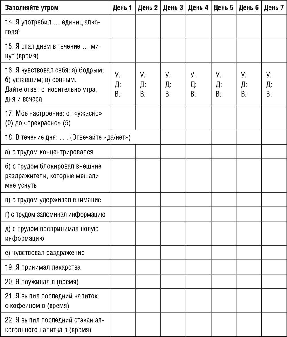 В течение недели ведите дневник сна, чтобы определить все паттерны или личные привычки, которые помогают или мешают качеству сна. Если у вас есть фитнес-трекер или специальное приложение на телефоне или часах, вы можете использовать его для заполнения этой таблицы.