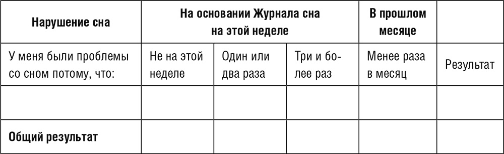Выпишите все факторы из вопроса 10 в вашем Журнале сна под столбцом «Я не могу уснуть потому, что» (каждую причину пишите в отдельной строке). Затем укажите частоту, с которой эти факторы нарушают ваш сон. Если на этой неделе сбоев не было, отметьте пункт «Не на этой неделе» галочкой. Если же вам кажется, что вы испытывали нарушения сна в прошлом месяце, отметьте пункт «Менее раза в месяц» и оцените результат следующим образом: