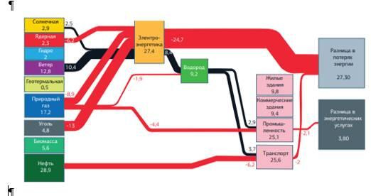 В одном из сценариев интеграции водородных технологий в энергокомплекс США, рассматриваемых лабораториями Министерства энергетики этой страны, к середине века водород возьмет на себя роль второго после электроэнергии всеобщего энергоносителя. На рис.В.3. представлены изменения в диаграмме (источник Lawrence Livermore National Laboratory, DOE USA) знергопотоков в США в 2040 г. в случае интеграции водородных технологий, красным отмечены сузившиеся потоки, черным расширяющиеся в квадриллионах BTU (1 квадриллион BTU = 25,21 млн. т.н.э). Более 90% энергии для производства водорода обеспечит электроэнергия, при этом потребность в первичной энергии угля, газа и нефти упадет на 73%, 34% и 18% соответственно, а доля ВИЭ (в первую очередь за счет ветра) возрастет в 45 раз.