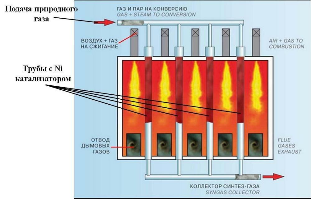 На этом этапе расщепляется метан и водяной пар на водород и монооксид углерода (синтез-газ):