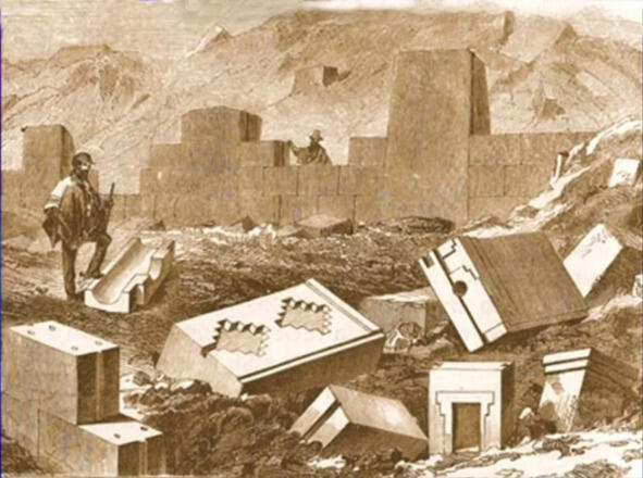 Рис. 26. Рисунок из книги Джорджа Скуайера 1877 года. Пума-Пунку, Тиуанако. В центре блок с 12 взаимно перпендикулярными ступенями [16]