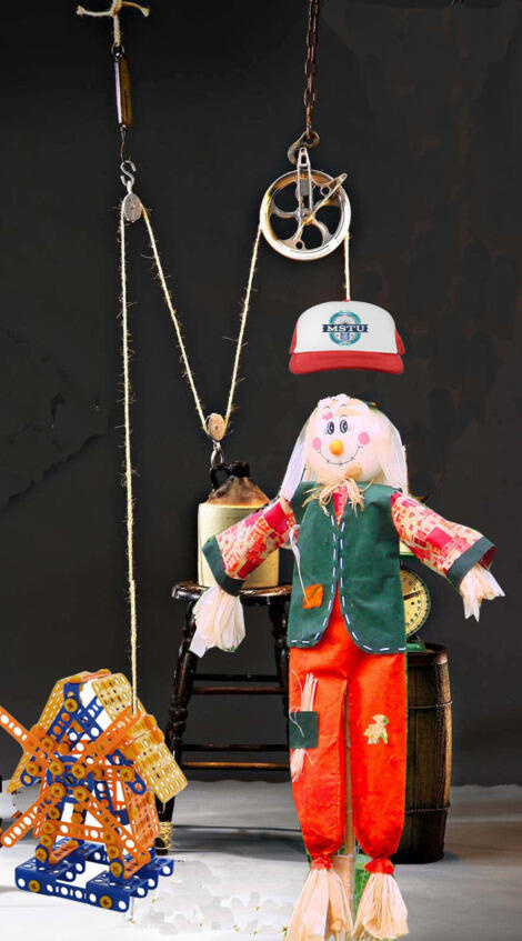 Костик привез с дачи очень симпатичное пугало, который стоял в огороде. В ознакомительной части олимпиады ребята построили вот такую шуточную машину Голдберга рис. 15.