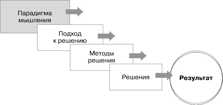 Обращаясь к объективным сложностям выбора любых решений, можно увидеть, что успех этого поиска существенно определяется ментальными установками исследователей. Здесь отчетливо проявляется закон парадигмальной зависимости решений[3]. Согласно ему, исход решения проблем целиком определяется парадигмой («парадигма» с греч. «образец») мышления, подчиняющей себе весь мыслительный процесс независимо от его содержания. Навязанный парадигмой подход к решению проблем определяет выбор методов решения, и, как следствие, сами решения оказываются плененными парадигмой неким несознаваемым образцом мышления. В простых, обыденных ситуациях принятия решений это спасает, а в новых приводит к результатам, мало полезным для дела (рис. 1.2).