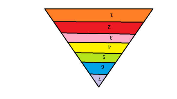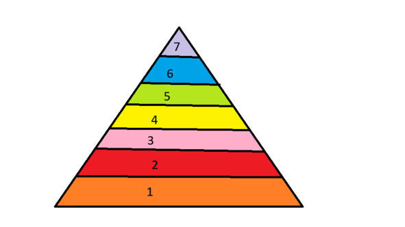 Я специально привела пирамиду Маслоу, потому что в корне не согласна с этой позицией. Посмотри ещё раз на рисунок. Тебе ничего не кажется странным? Маслоу отвёл физиологическим потребностям намного больше места, чем потребностям духовным. Подобное присуще человеку очень низкого уровня, который практически не развивается духовно. Для человека 6, 7 и высших рас эта пирамида выглядела бы иначе, а именно (обозначения те же самые, что и на предыдущем рисунке).