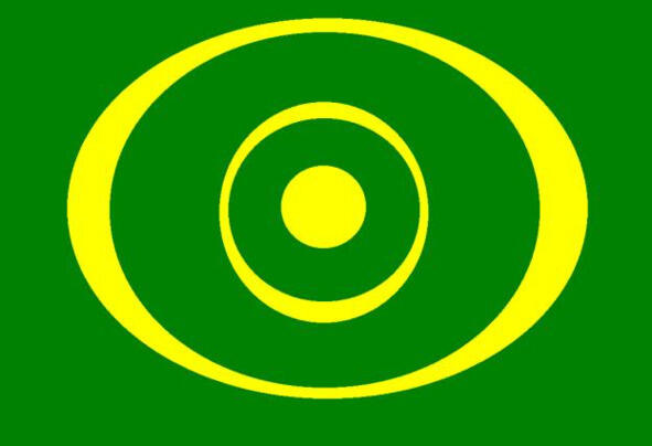 Жёлтый круг в центре Мандалы, от которого исходят жёлтые окружности и всё это на изумрудном или зелёном фоне.