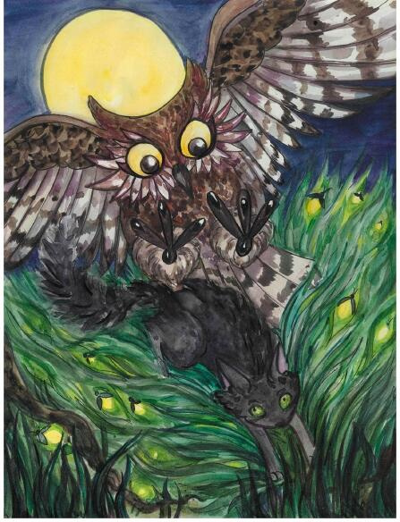 А сегодня заигрался Мистер Полночь в сумерках увидел огонёк, а потом ещё один и ещё один. И давай за ними гоняться. Выбежал на поле, а там на каждой травинке по такому светящемуся огоньку. Он как прыгнет, а они в стороны разлетаются, как искры от костра, волшебство! Так и «охотился» он за светлячками, пока не понял, что убежал очень далеко от дома, заблудился, а вокруг темнота, и только светлячки поблёскивают. Да и те вскоре разлетелись. Забился он под куст и свернулся в клубочек.