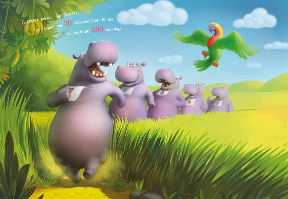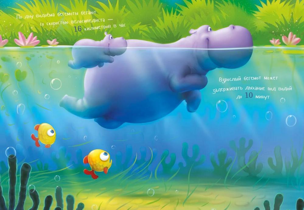 Бегемоты не столько плавают, сколько ходят по дну. Однако и плавать мы ещё как умеем вспомни про заплыв на Занзибар. Во время плавания мы гребём задними конечностями, как лягушки. Запросто можем и нырнуть. Но ненадолго минут через пять выныриваем глотнуть свежего воздуха. При всём при этом мы в полной безопасности и не собираемся вопить SOS, потому что толстый слой подкожного жира для нас как спасательный круг. Но, если честно, больше всего мы любим не плавать и не нырять, а целый день спать в реке. Однако нам бывает и не до сна. В случае опасности мы можем сбежать от неё весьма шустро, несмотря на наше могучее телосложение. Развиваем скорость около 30 километров в час. Не веришь? Ну, давай рванём наперегонки!