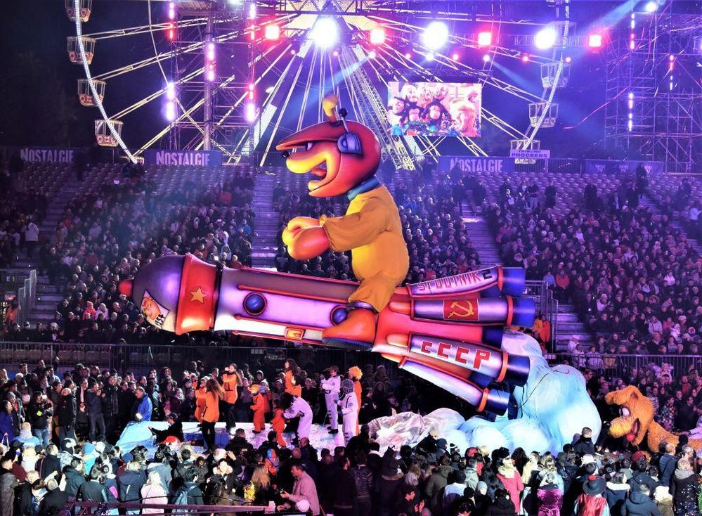 Вечернее шествие началось с наступлением темноты. Пока люди рассаживались, та же группа артистов разогревала публику. Народу на трибунах было гораздо больше, чем днем, а внизу вообще толпы! Тема представления была космическая, шествие открывал Король Мистер Космическое Пространство. Огромный, почти с шестиэтажный дом, медленно выплывал он из-за поворота. Сделан из папье-маше, хорошо гореть будет. На его платформе толпились куклы поменьше, а в очередь уже выстроились остальные персонажи. Были и сказочные фигуры вроде Белоснежки и семи гномов, собаки Белка и Стрелка в ракете, Пиноккио, Жар-птицы