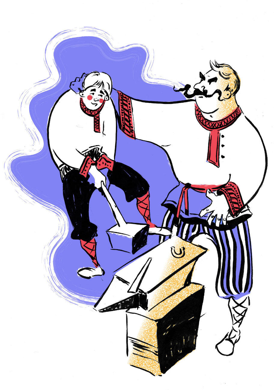 Пустился на авось Михей: взял проковырял шилом по обе стороны, где лопнуло, еще по дырке порядочной, просунул туда бечеву насмоленную и давай затягивать Стянул в кучу, где лопнуло, а где снова проковырял, там еще разорвал. Видит Михей дело плохо, не по его разуму, струхнул, и жене не показывает, хоть той и очень хотелось бы посмотреть, как муж боярские сапоги чинит. Вот Михей, расковыряв сапог, взял поскорей вару, черной смолы и ну замазывать Заклеил и дырки, и бечеву, насадил лепешку в полсапога и так отделал его, что и самому страх смотреть Поставил под лавку и говорит жене: «Смотри, завтра придут за сапогом, отдай его. Скажи, мол, совсем готов, и за работу погоди просить, а слушай, что служитель станет говорить. Если не понравится что, скажи, меня дома нет, в лес по дрова пошел».