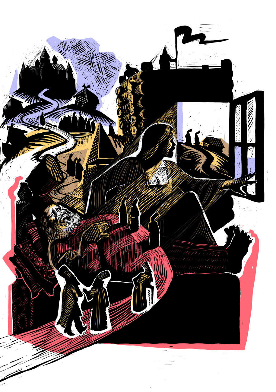 Услышав это, бояре и дворяне, старые и малые, новички и бывалые встали-встрепенулись, умылись, Богу помолились и отправились во дворец царя Тафуты. Тут им сделали такой разбор: кто женат, ступай на двор, а кто холостой у ворот постой, не про него дело; речь идет о том, как жен выбирать, так холостому в этом совета давать не приходится!