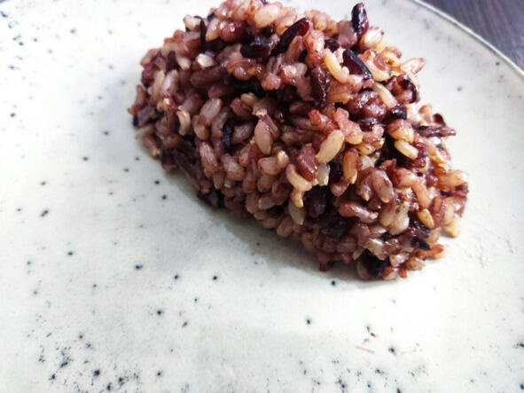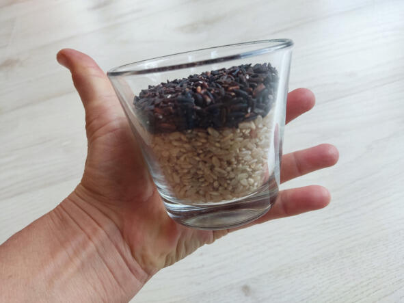 Заливаем кипятком, сливаем. Снова заливаем, чтобы вода покрывала рис примерно на 2 см.