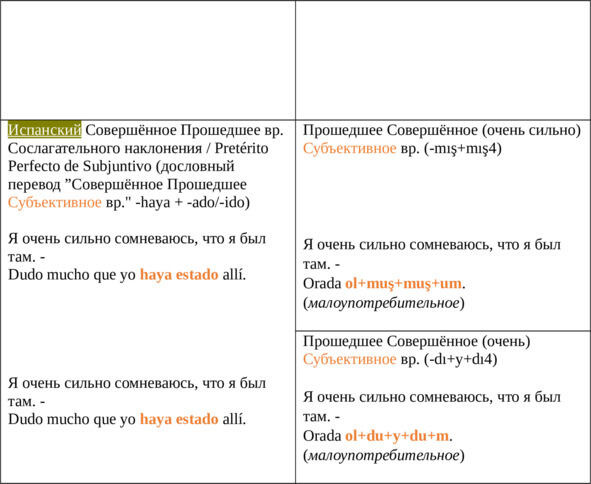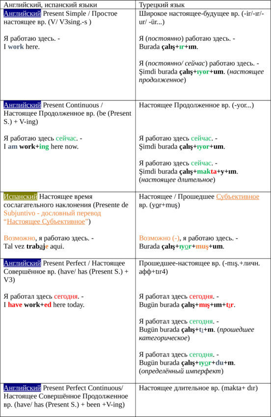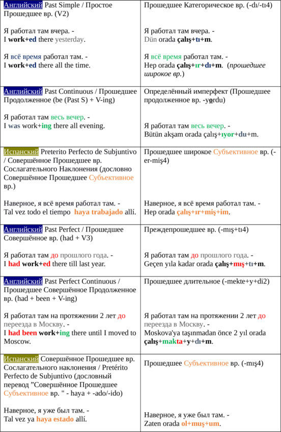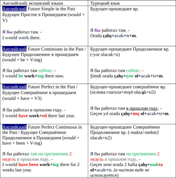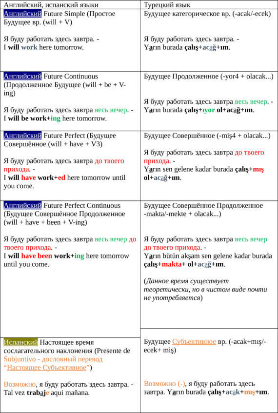 * Это основные времена, есть еще Будущее категорическое продолженное, Будущее категорическое совершённое и, соответственно, Будущее-прошедшее продолженное, Будущее-прошедшее совершённое время. Однако в удобную и относительно небольшую таблицу они не уместились.