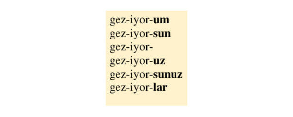 Önce (сначала) Önce (направительный пад.) (в ванную комнату) Önce (настоящее продолженное вр.) (он бежит)Önce (потом) Önce (творительный пад.) (молнией) Önce (смена согласной + направительный пад.) (на кухню) Önce (бежит) Önce (и) Önce (наконец) Önce (притяжательное местоимение + творительный пад.) (со мной) Önce (исходный пад.) sonra (попрощавшись) Önce (исходный пад.) (из дома) Önce (конверб -arak/-erak) Önce (настоящее продолженное вр.) (выбегает) Önce (и) Önce (направительный пад.) (в школу) Önce (настоящее продолженное вр.) (направляется).