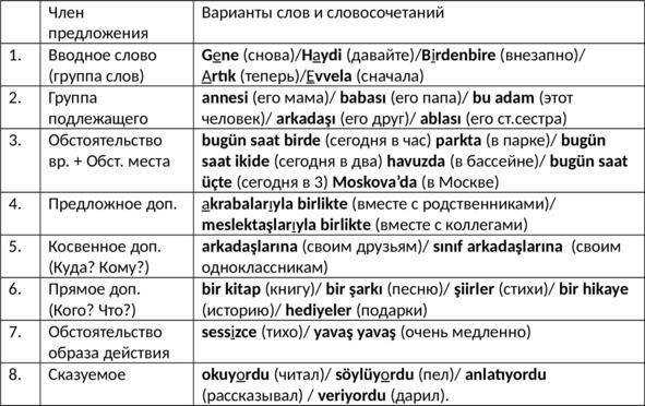 5. Öğle..(исходный пад.)evvel saat yedi..(местный пад.) (в семь часов утра) Moskova..(апостроф + исходный пад.)Antalya..(апостроф + направительный пад.)uçmak..(причастие настоящего-прошедшего вр. -an/ en)bir uçak..(местный пад.) (в самолете, летящем из Москвы в Анталию) iki adam (двое мужчин) yan yan..(направительный пад.) (рядом друг с другом) oturmak..(причастие прошедшего вр. -mış/-miş/-muş/-müş) (сев) konuşmak..(определённый имперфект) (разговаривали).