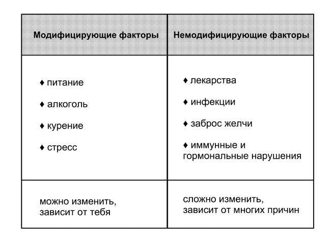 Первые четыре причины питание, алкоголь, курение и стресс. Следующие четыре причины, которые не зависят или не полностью зависят от человека: лекарственные препараты, вирусные и бактериальные инфекции, забрасываемая из двенадцатиперстной кишки желчь и иммунные нарушения.