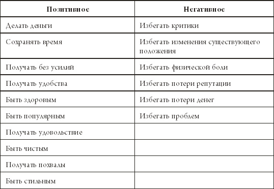 Исходя из этих основных потребностей, человек всегда испытывает желание получать позитивное и избегать негативного (табл. 1).