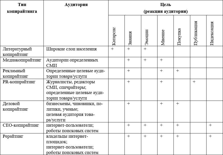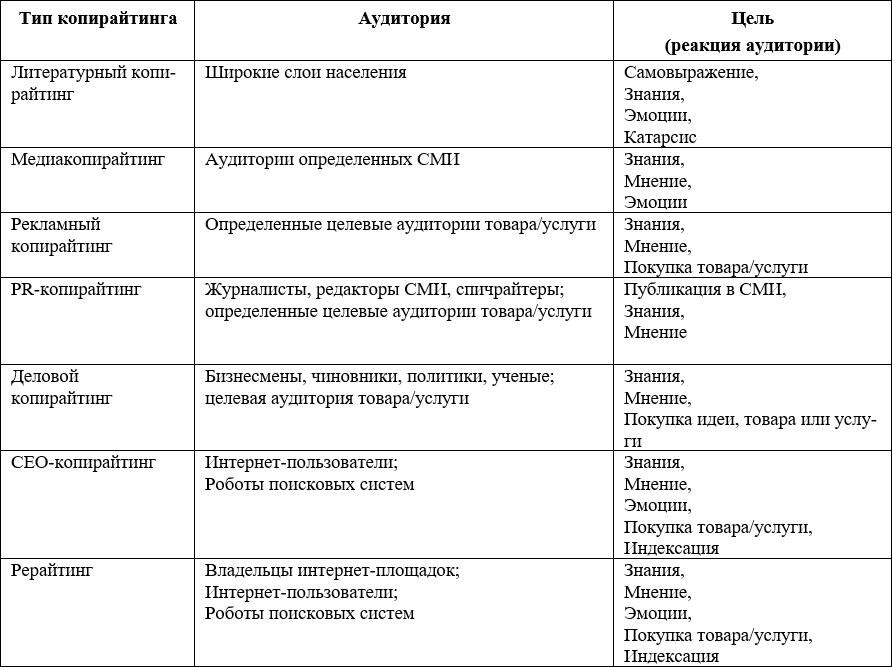 Если свести воедино важнейшие характеристики различных типов копирайтинга, то мы получим следующую таблицу-матрицу копирайтинга: