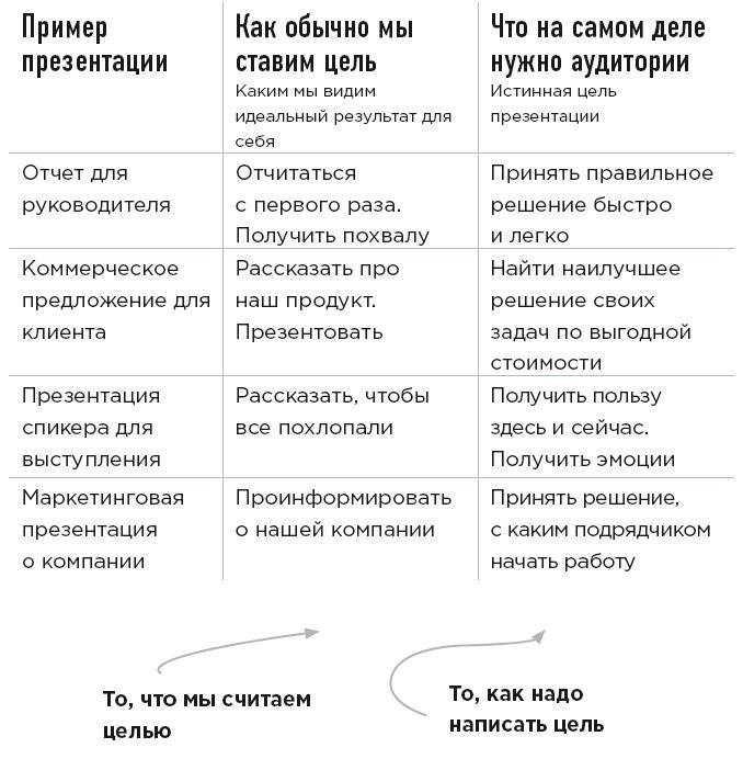 Мы формулируем цель как «отчитаться», «донести информацию», «рассказать». Но это сильно отличается от того, что нужно нашей аудитории.