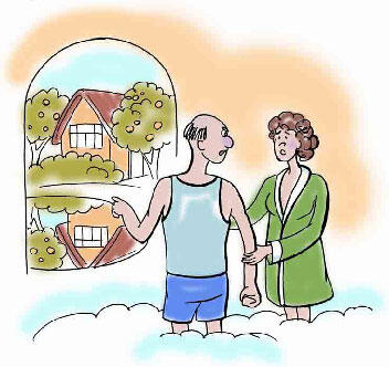 Показывает домик в зелени у озера с прозрачной, как слеза водицей