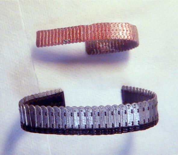 Фото 2.1.1. Пример миграции красителя из детали в лакокрасочный слой Вверху деталь, окрашенная мигрирующим (как оказалось) красителем, внизу пигментом. Детали покрашены одной краской акриловый металлик + акриловый лак. Результаты разные. Эффект миграции проявился примерно через 23 месяца.