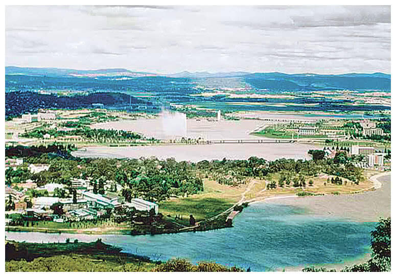 Столица Австралии Канберра живописно раскинулась по берегам искусственного озера Берли-Гриффин, посреди озера поднимается струя мощного фонтана