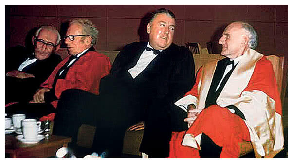 Руководители Австралийского национального университета за чашкой вечернего кофе. На переднем плане сэр Резерфорд Робертсон