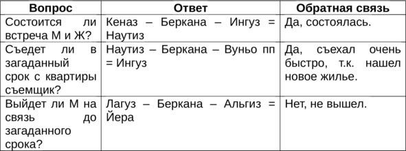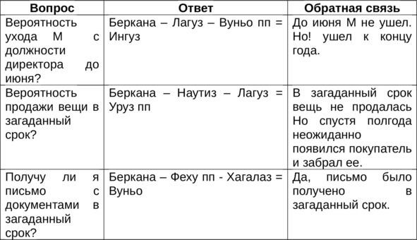 Еще мне запомнился следующий случай из личной практики: однажды на вопрос жив или мертв пропавший парень выпала перевернутая Беркана. Я тогда только-только начинала изучать руны и, конечно, подумала, что если реверс, то это однозначный отрицательный ответ и парень мертв. Однако позже выяснилось, что парень жив, просто сбежал из дому в другой город и попал там в какую-то передрягу. Таким образом, всегда надо иметь в виду, что реверс это не обязательно «нет», а в односложных раскладах ответ всегда лучше читать по смысловому содержанию выпавшей руны. В данном примере реверс Берканы говорил всего лишь о потере материнской опеки и защиты, но человек при этом остается живым.