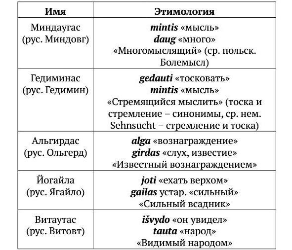 Этимология имён великих князей литовских также указывает на их балтское происхождение.