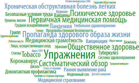 Как правило, анализ ключевых фраз и слов целевая аудитория использует для поиска интересующего материала, а для определения тематической и терминологической области поиск ключевых фраз и слов является определяющим для глубины терминологической специализации исследования. Визуализация топ-50 ключевых слов с 2017 по 2020 год по рубрикам: «Клиническая медицина», «Управление здравоохранением», «Общественное здравоохранение, окружающая среда и гигиена труда» на основании данных Scopus представлена в таблице 1.2.5.
