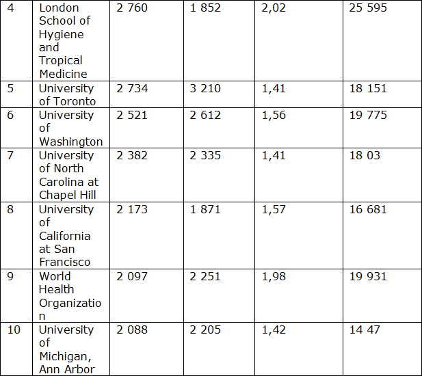 Ниже представлена сравнительная характеристика публикационной активности топ-10 мировых научно-исследовательских институтов за период с 2017 по 2020 год по рубрикам: «Клиническая медицина», «Управление здравоохранением», «Общественное здравоохранение, окружающая среда и гигиена труда» на основании данных SciVal (табл. 1.2.2).