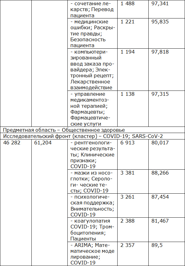 Выявление исследовательских фронтов и определение приоритетнх направлений является одной из наиболее значимых проблем в науковедении и научной политике и имеет решающее значение на этапах планирования научной деятельности[21]. Проведенный сотрудниками НИИОЗММ ДЗМ совместно с представителями РФФИ анализ цитируемости для выявления фронтов позволил составить общее представление о результатах научно-исследовательской деятельности в различных отраслях медицины.