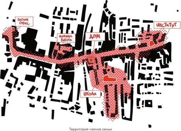 ВЛАДЕНИЯ Человеку необходимо чем-то владеть. Даже если мы живем в съемной квартире мы меняем ее под себя, и именно привилегия внесения изменений и определяет владельца, пусть и временного. Хотя, по сути, разве есть что-то НЕ временное в этом мире? Человеку свойственно присваивать и общественные места. Мы выбираем себе любимый холм, с которого видно город, дарим друг другу звезды (что не так уж и абсурдно; как говорил герой одного фильма, и Америка была когда-то подарена Колумбом королеве. Тут главное, кто первый застолбил). Даже когда садимся в кинотеатре на одно кресло, складываем вещи на соседнее для расширения границ своих временных владений. Это, кстати, называется маркеры личного пространства[8]. Графически границы собственности твоей семьи можно выразить так: сумма всех территорий, которыми вы все «владеете». Например: это 3 км от дома до маминой работы, вместе со всеми фасадами, светофорами и ямами на тротуаре + все закоулки, бродячие коты и кусты, которые исследует младший брат + пробка до работы, которую преодолевает отец. Этот ежедневный театр формирует сознание каждого, кто в нем вынужден пребывать.