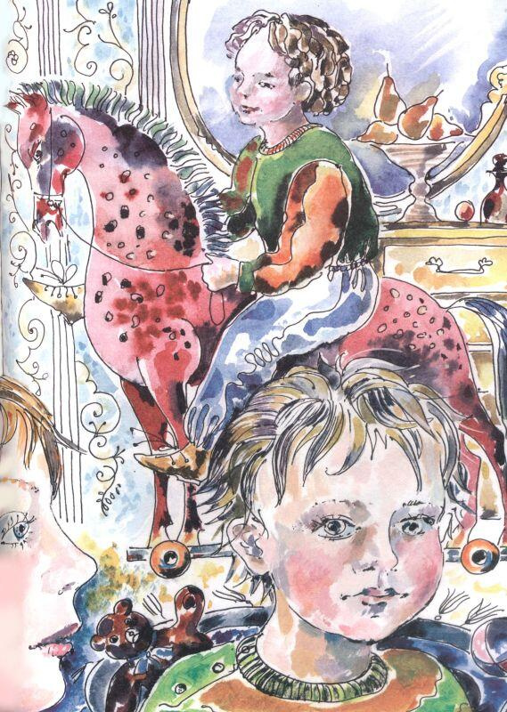 И тут пришёл папа. Он принёс с рынка яблоки, груши, виноград и подарок Димке большого красного коня в прозрачной сумке.