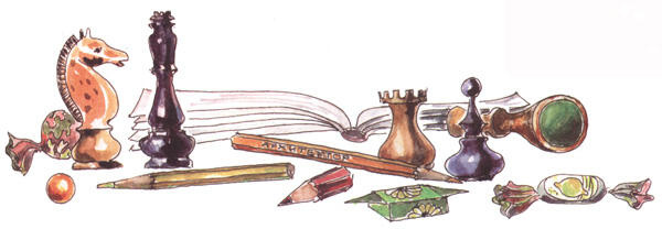 Карандашей в шкафу целая пачка, коротенькие и длинные, простые и цветные. И большие старые шахматы доска тёмная, фигуры резные, и у чёрного короля голова отскочила и потерялась.
