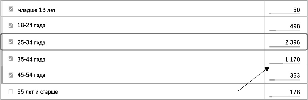 Например, здесь большинству клиентов от 25 до 34 лет. Но посмотрите в категории 3544 тоже много людей. Скорее всего, придется создать два разных персонажа.