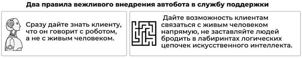 Еще драматичнее ситуация: когда человек звонит в контору. В ответ ему вежливо отвечают. Адекватно реагируют на вопросы. И вдруг звонящий понимает он разговаривает не с живым оператором, а с классно сделанным ботом, роботом. Это как пощечина. Просто хамство со стороны кампании. Клиент чувствует себя обманутым идиотом. А проблема решается просто. Здороваясь, робот должен представиться.
