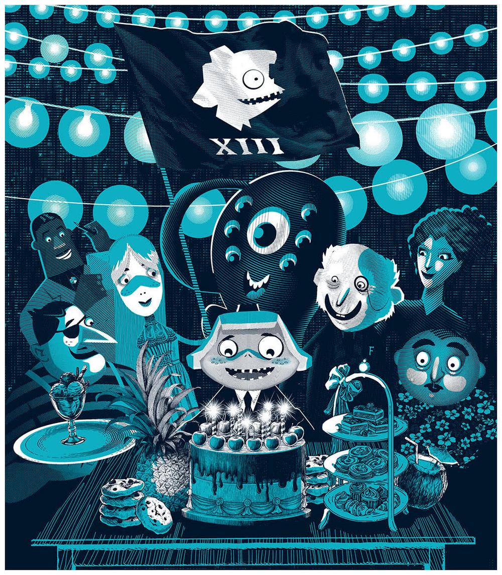 Все его друзья собрались на крыше, весело ее украсили, развесив гирлянды лампочек и воздушные шары. Петула и Скетчи держали большой флаг, на ткани был вышит профиль Уоррена, а под ним золотыми нитками цифры XIII. Флаг весело хлопал на ветру, а Скетчи громко свистел и размахивал щупальцами. Вороны, живущие на крыше, истошно каркали, обрадовавшись поводу пошуметь.