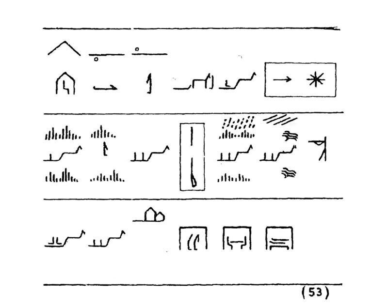 Ил. 9. Схема Линцбаха показывает маршрут человека, живущего в избе под горою. Рано утром на восходе солнца он запрягает в сани лошадь и едет в город. Через некоторое время дорога уходит в лес. Там он нагоняет охотника и тоже сажает его к себе в сани. Внезапно начинается сильный снег, путники теряют дорогу, за ними гонятся волки. Путники отстреливаются, и волки отстают. Наконец они добираются до жилья, ужинают и остаются ночевать, хотя метель к тому времени уже прекратилась. Флоренский иронизирует по поводу этого примера, приводя его в качестве доказательства того, что искусственный язык Линцбаха годится лишь для «простейших расказцев»