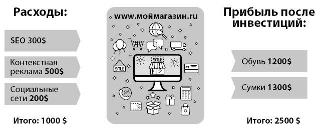 Например, к затратам на рекламу в интернет-магазине одежды и обуви «www.моймагазин. ru» относятся затраты на SEO-продвижение, контекстную рекламу, социальные сети. Общая сумма потраченных денег составляет 1000$ (300$, 500$ и 200$ на каждую статью соответственно).