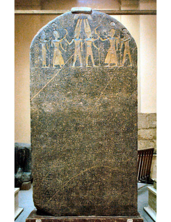 Вернемся к Мернептаху, главному герою нашего повествования. Почти сразу после начала своего правления он затеял серию широкомасштабных военных походов с целью смирить мятежи в провинциях. Мятежи после смерти очередного фараона являлись совершенно обычным делом для населения захваченных этим фараоном земель. Основные походы фараон направил против племен ливийцев4 на Западе, но досталось от египетских войск и Нубии на юге, и «горемычной Ретену», Ханаану (Леванту) на северо-востоке. По приказу Мернептаха, его победы были увековечены писцами и каменотесами в каменных стелах и на стенах храмов. Славный египетский придворный писец не подвел своего сюзерена. Пышные гиперболы, похвалы, сравнение с богами и возвеличивание имени фараона ему удались на сей раз как никогда хорошо. Но из многих, дошедших до нас надписей периода правления Мернептаха, речь пойдет только об одной, выполненной на стеле из прекрасного черного гранита. Заметим попутно, что Мернептах с немалым удовольствием использовал в качестве материала для своих памятников уже готовые камни и стелы из построек, воздвигнутых прежними правителями Египта. И в данном случае он остался верен своей традиции надпись о новых победах Мернептаха была высечена на обратной стороне стелы Аменхотепа III, фараона великого и известного своими завоеваниями, жившего на полторы с лишним сотни лет до Мернептаха. Если перенести данное действие не более понятную русскоязычному читателю почву, предположим, что при Николае Втором использовали для строительства его памятников постаменты монументов Екатерины Великой. У Мернептаха к монументам времен Аменхотепа III была какая-то особая, очень сильная, любовь. По его приказу камни из архитектурных ансамблей именно этого фараона широко использовались для строительства заупокойных храмов, молелен, статуй Менрептаха. Остается гадать, почему именно Аменхотеп III столь привлек нашего героя своим качественным строительным материалом. Но эти загадки оставим египтологам и знатокам личностей человеческих. Пусть они пытаются через более чем три тысячи лет понять тонкую натуру престарелого фараона.