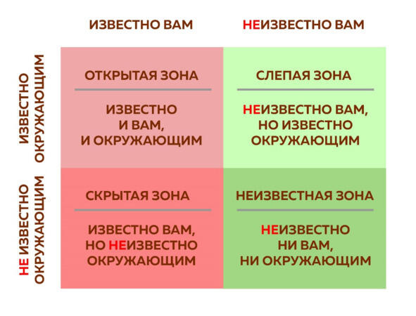 Это модель, показывающая, насколько вы сами себя знаете. Сначала опишите себя с помощью прилагательных (активный, терпеливый, застенчивый и т. д.), а потом попросите сделать то же самое других. Для удобства можете сделать опросник с заголовком «Опишите (ваше имя)» в виде формы в Google Docs. В опроснике используйте вопросы типа: «Каким вы меня видите сейчас?», «Какие черты мне присущи?», «Какие у меня недостатки?», «Какие у меня достоинства?» Попросите ваших приятелей и коллег ответить на вопросы этого опросника анонимно. Далее возьмите лист бумаги и разделите его на 4 части, как показано на картинке, и внесите туда свои и полученные данные.