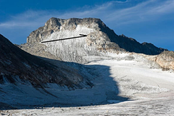Следы были на снегу, точнее почти фирн, пересекали ледник (в этой части ледник крутой, что хорошо видно на фотографии) с запада на восток, от одного куска гребня хребта, за которым отвесные стены, и уходили за восточные скалы.