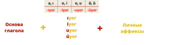 Если основа глагола заканчивается на согласную, следует прибавить к ней аффикс настоящего времени, исходя из закона гармонии гласных на 4: