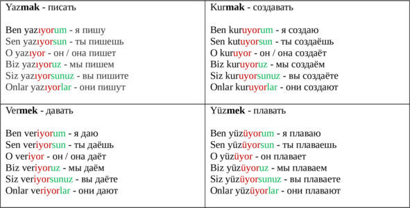 * В турецком языке у глаголов в инфинитиве только 2 вида окончаний (-mak или -mek).