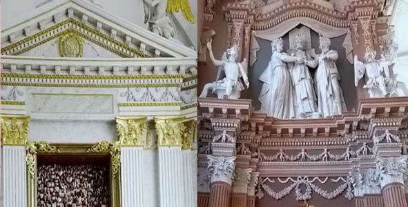 Алтарь Конгрегатской каплицы гродненской Фары (слева) и один из алтарей базилики Рождения Марии в Шилуве. На обоих алтарях виден характерный для Т. Подхайского орнаментальный пояс с антропными фигурками.
